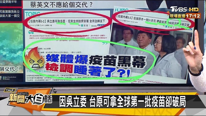 TVBS台1月初有政論節目爆料指出,有名民進黨籍的吳姓立委介入新冠疫苗採購,導致東洋疫苗採購案破局,其中牽涉百億元龐大利益。當時中央流行疫情指揮中心發言人莊人祥駁斥是錯誤訊息,並強調會做「進一步處理」;3月16日,國家通訊傳播委員會(NCC)發函該媒體,指內容「有欠妥適」要求改進,讓網友不禁質疑,繼中天新聞關台後,綠營打手NCC是否又用同樣套路瞄準TVBS?