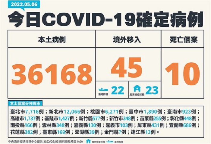 中央流行疫情指揮中心今(6)日公布國內新增36,213例COVID-19確定病例,分別為36,168例本土個案及45例境外移入(22例為航班落地採檢陽性);另確診個案中新增10例死亡。