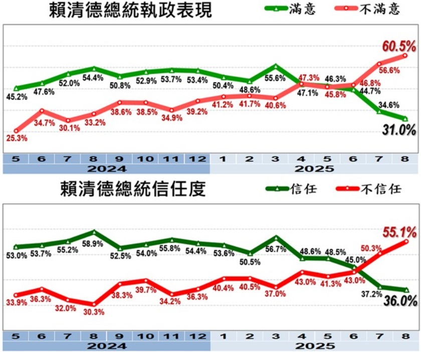 「請問,整體來講,您對賴清德總統是信任、或不信任?」美麗島民調針對總統信任度最新調查結果顯示,信任度創下歷史新低來到36%,不信任度更躍升到55.1%歷史新高度,大罷免之後執政黨的警訊徹底響起。